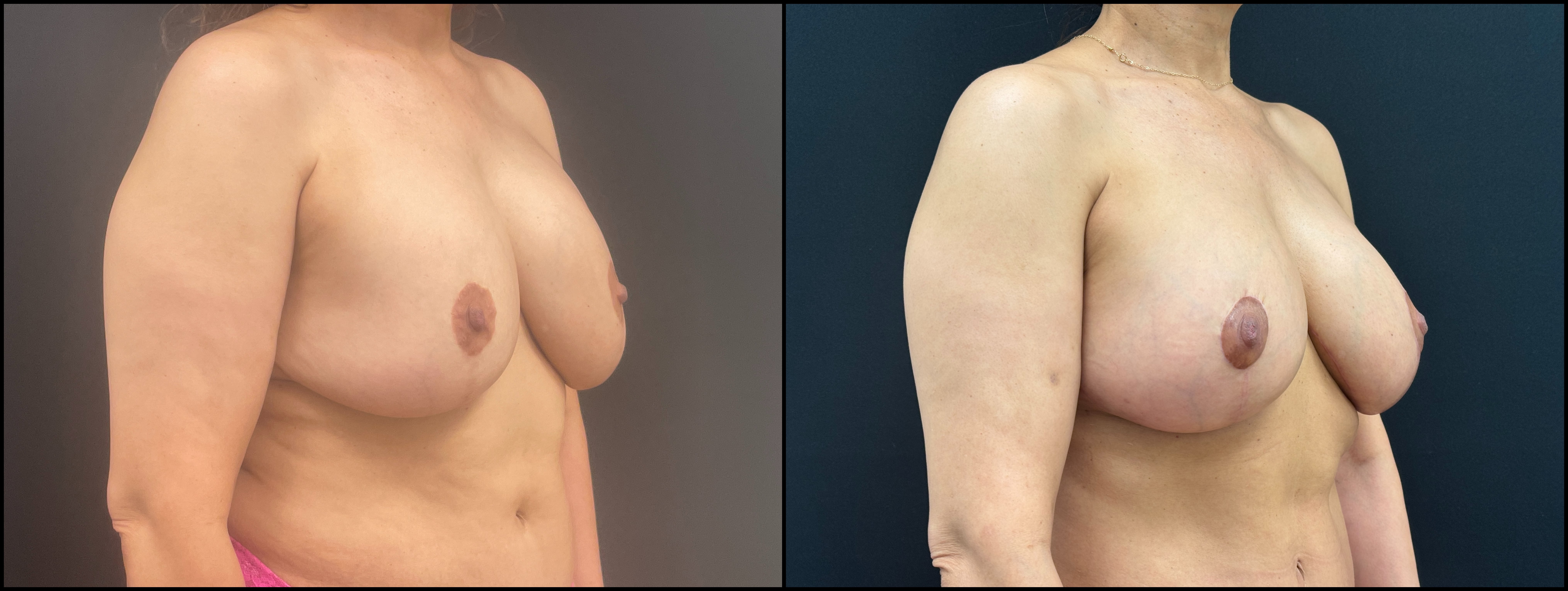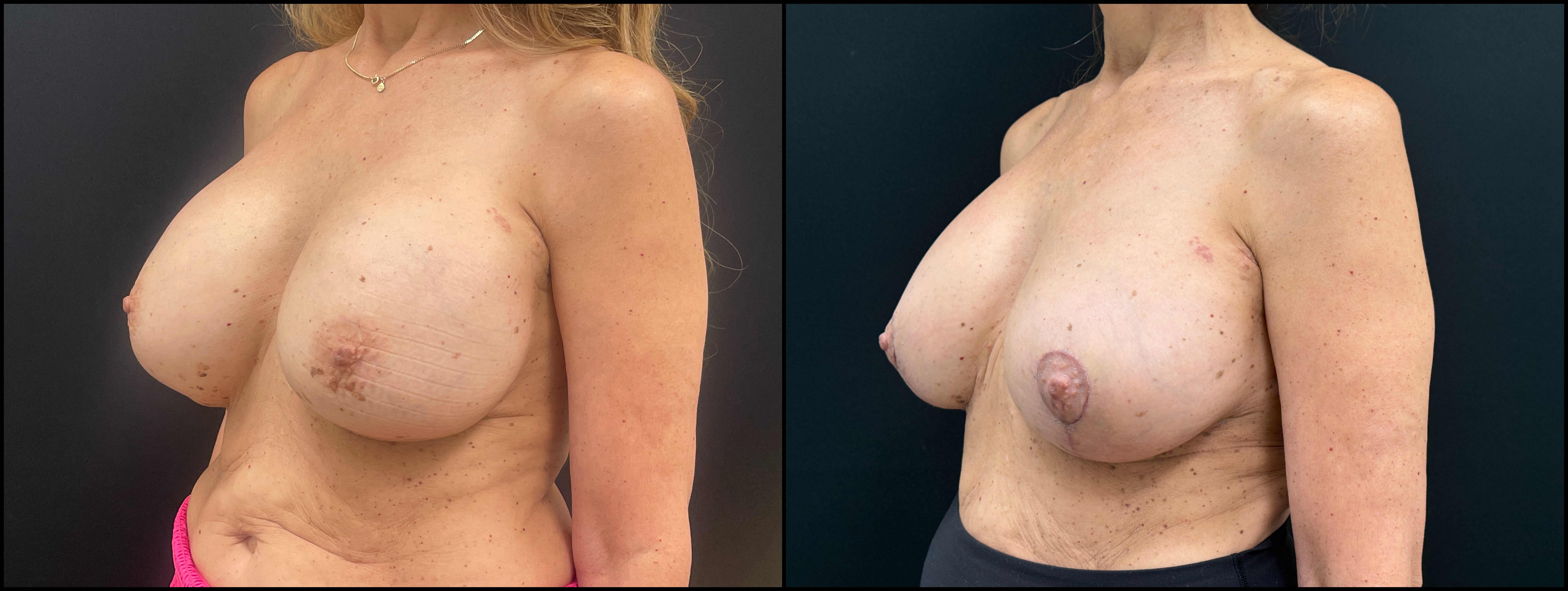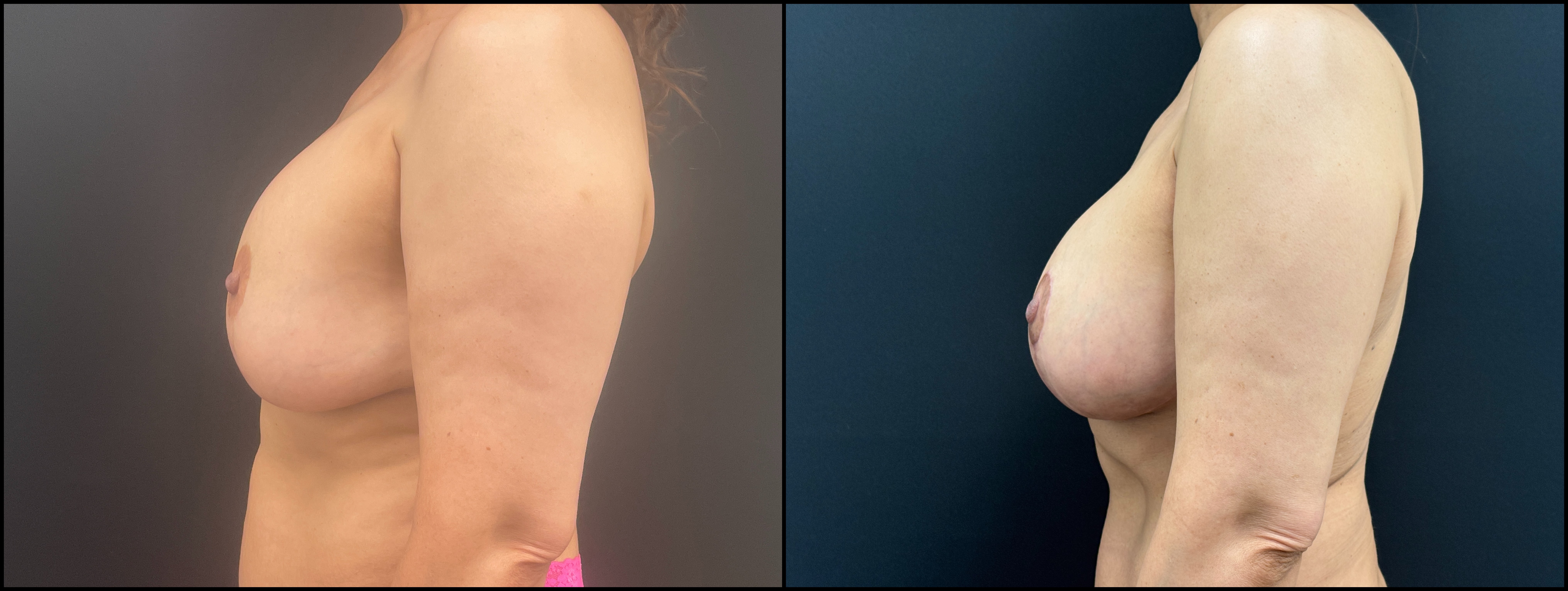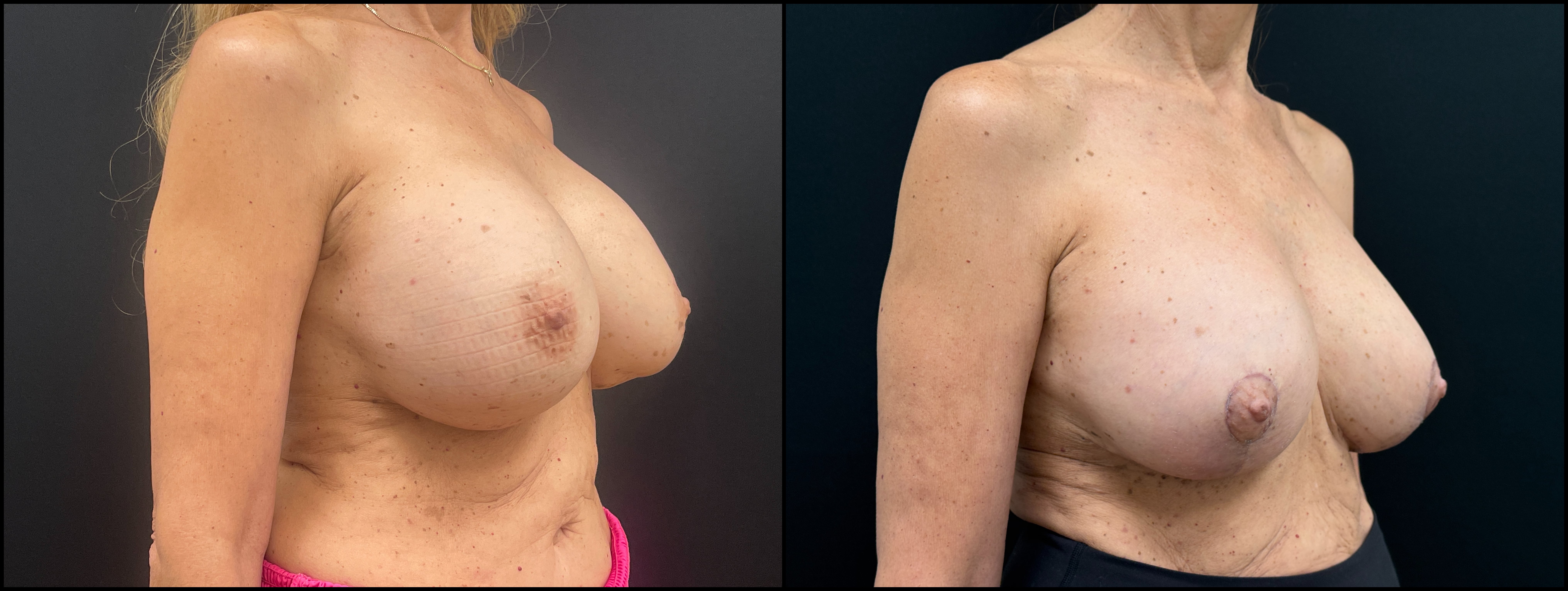 Age: 56, Removal of old textured silicone implants with capsulectomies, replacement with SSM implants, tightening of intermammary fold.